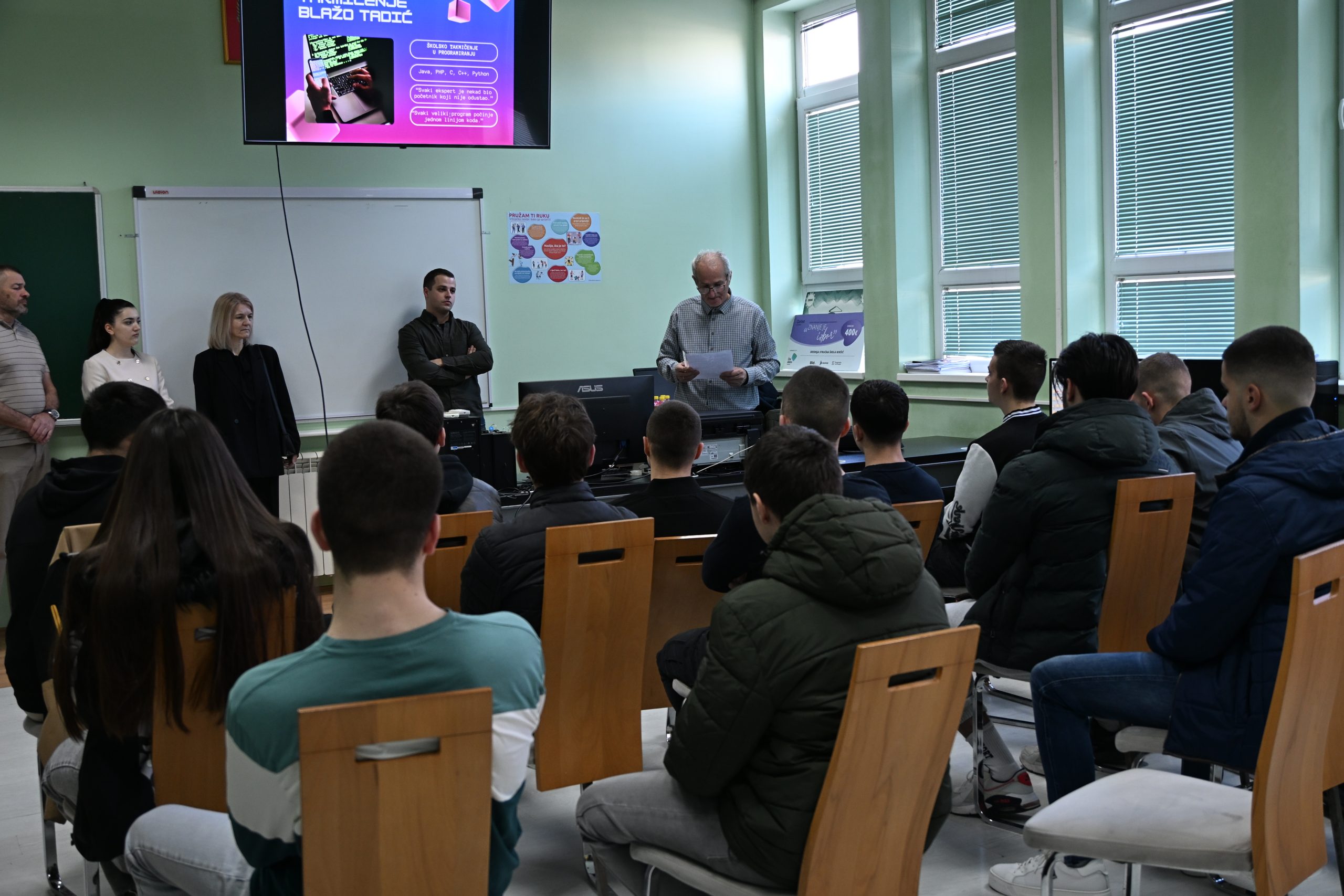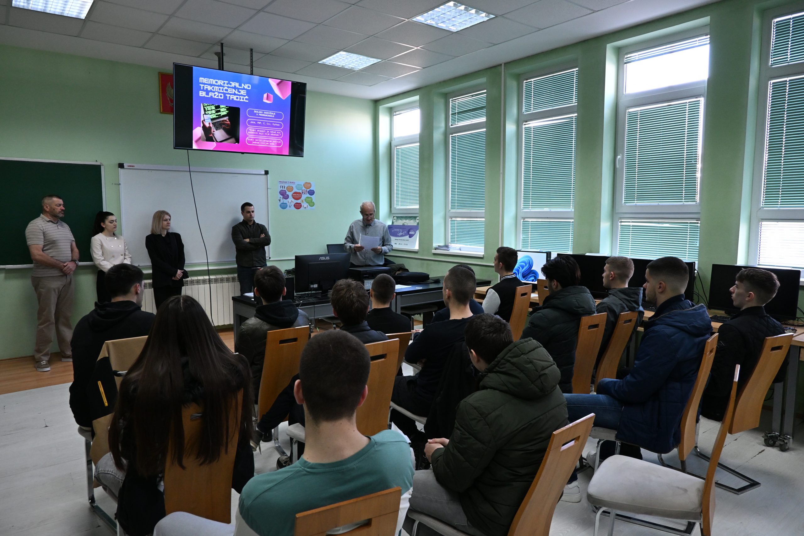 U našoj školi je u utorak, 10. marta 2026. godine, održano školsko takmičenje u programiranju posvećeno uspomeni na našeg bivšeg učenika Blaža Tadića, koji je tragično nastradao u saobraćajnoj nesreći. Takmičenje je organizovano kao izraz sjećanja i poštovanja prema njemu, ali i kao podsticaj učenicima da razvijaju interesovanje za programiranje, logičko razmišljanje i savremene informacione tehnologije.